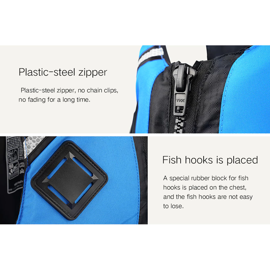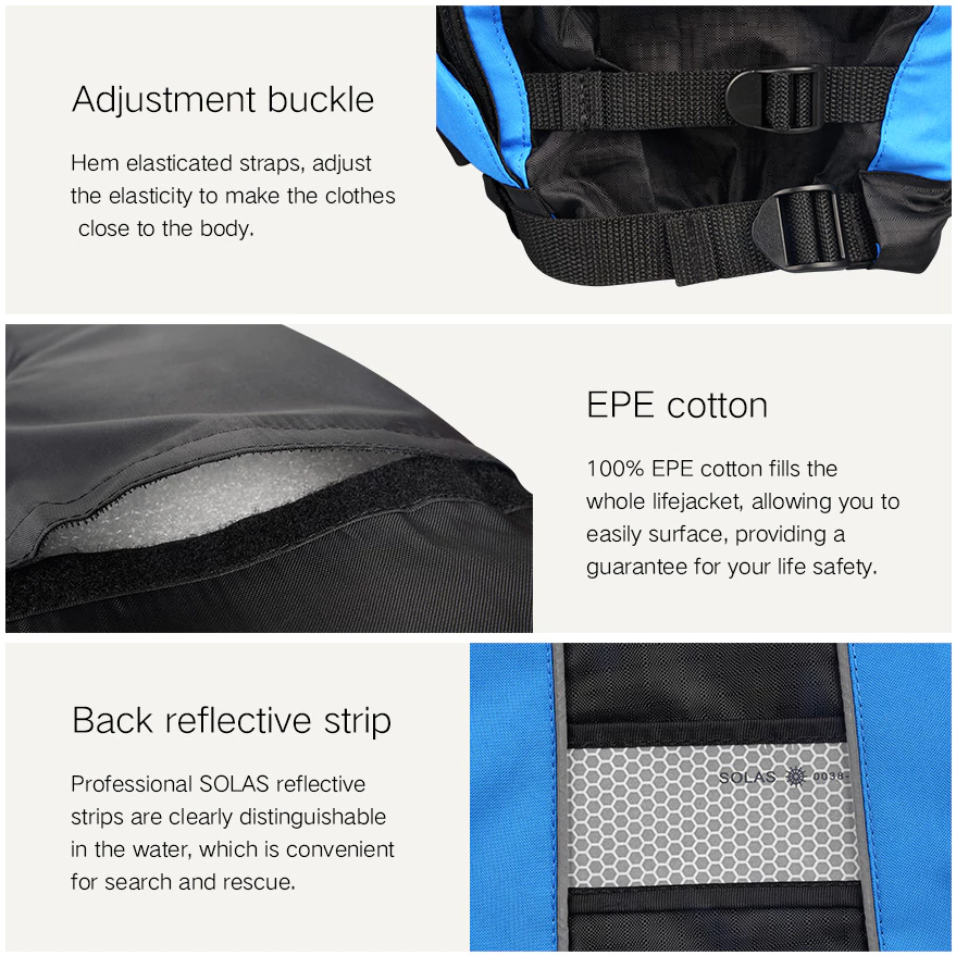 ผลิตจากผ้าฝ้าย EPE 100% แถบสะท้อนแสง SOLAS สามารถแยกแยะได้อย่างชัดเจนในน้ำ ซึ่งสะดวกสำหรับการค้นหาและกู้ภัย ซิปพลาสติกเหล็กไม่ซีดจางเมื่อใช้เป็นเวลานาน บล็อกยางพิเศษบนหน้าอกสำหรับตะขอเบ็ดตกปลา แถบยางยืดที่ชายเสื้อปรับความยืดหยุ่นเพื่อให้เสื้อผ้าแนบชิดกับลำตัวได้